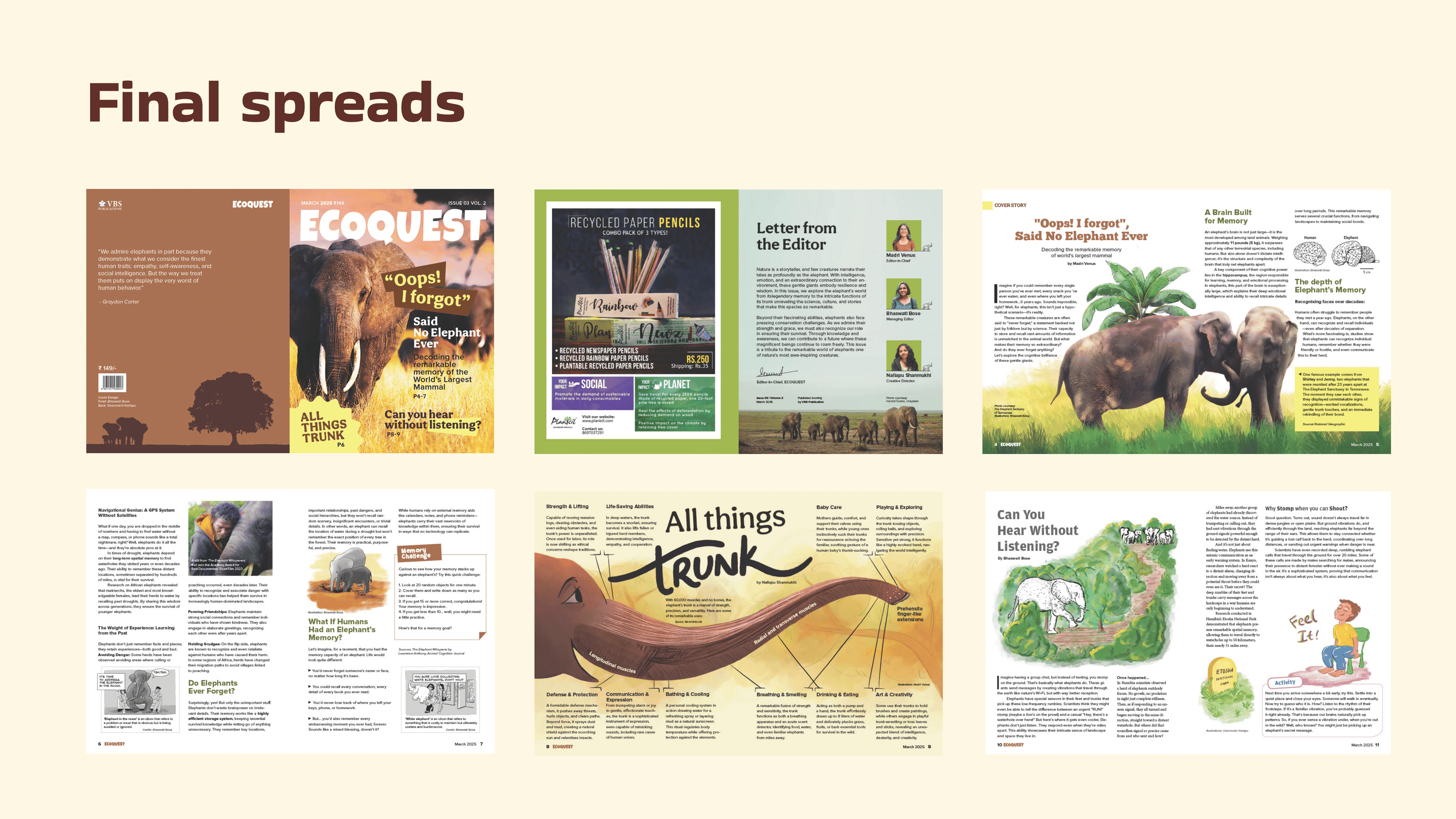 EcoQuest is a digest-sized nature and wildlife magazine for young adults aged 12–18 — readers with curiosity for the natural world who want content that respects their intelligence and rewards their attention. Developed as part of a publication design course at the National Institute of Design, Ahmedabad, the project required a team of three — Madri Venus, Bhaswati Bose, and Shanmukhi Nallapu — to conceptualise, research, write, and design a complete magazine from scratch. The inaugural edition centres on elephants, under the cover theme All Things Trunk, with features on elephant memory and infrasonic communication woven through a fully realised editorial and visual system.